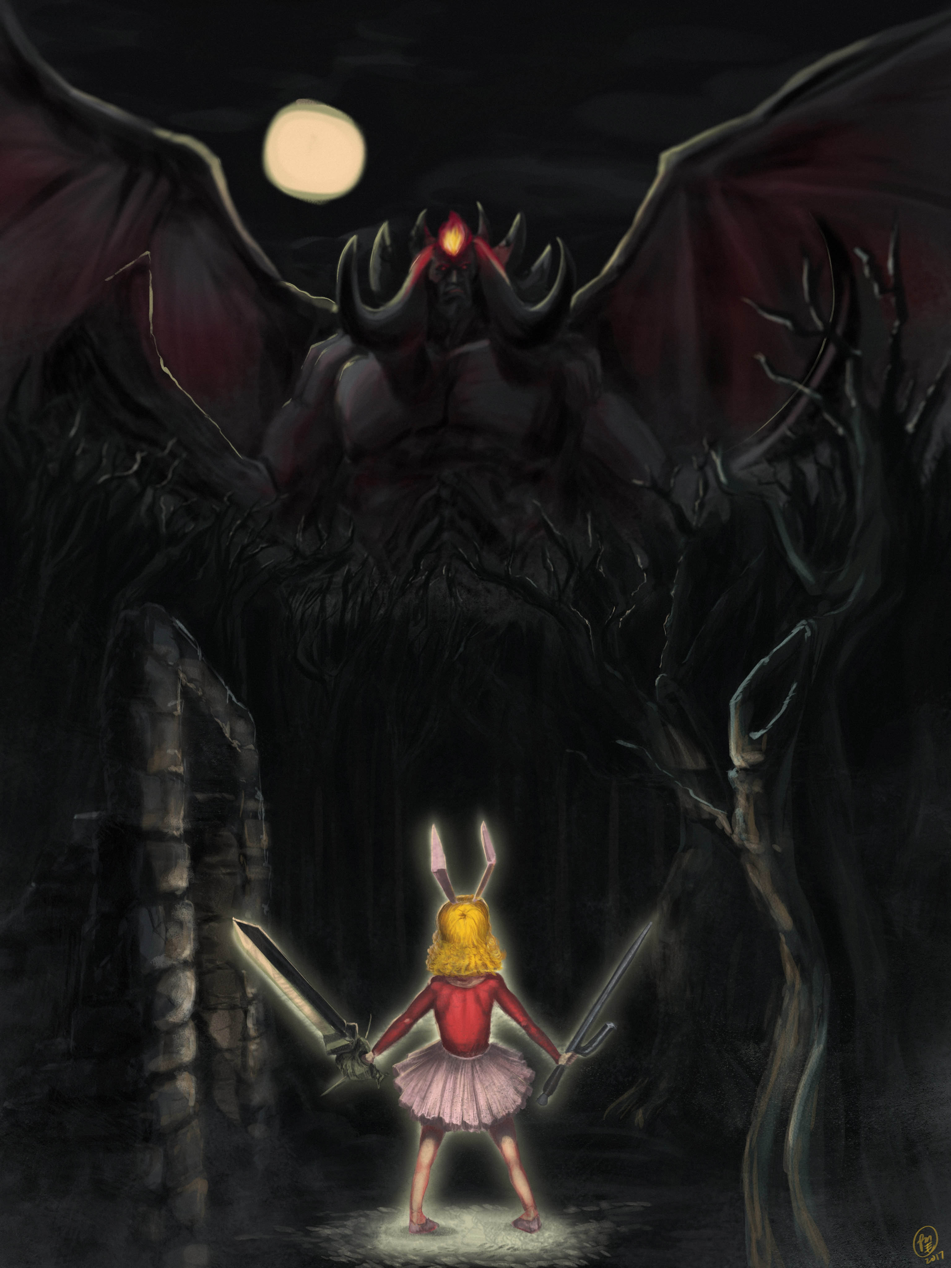 He wanted to show a scene in which a weak character(little girl) preparing for a fight against one of the meanest demon's in the game's lore. Equipped with powerful weapons, to anyone that knows the game, should understand that the fight might be difficult, but given enough time, the underdog shall rise.